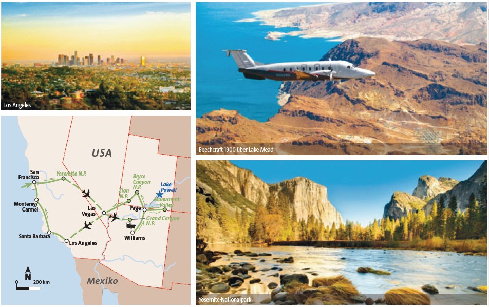 Der Südwesten mit seiner Aura der unbegrenzten Möglichkeiten und der ungezähmten Wildnis versprüht noch heute den Hauch der Abenteuerlust. Bewundern Sie die faszinierenden Naturschönheiten sowie die pulsierenden Metropolen entlang der kalifornischen Pazifikküste aus ganz neuen Perspektiven.